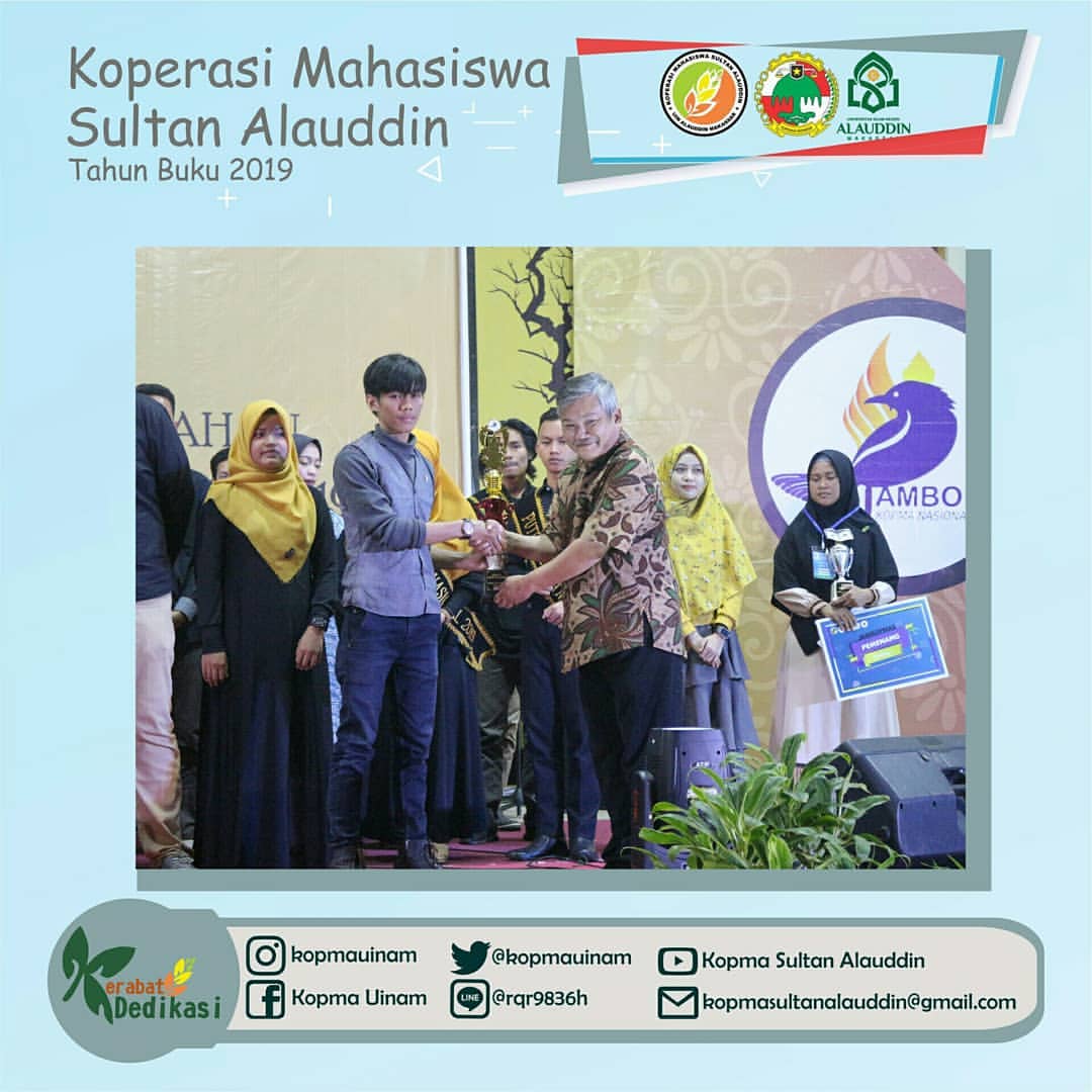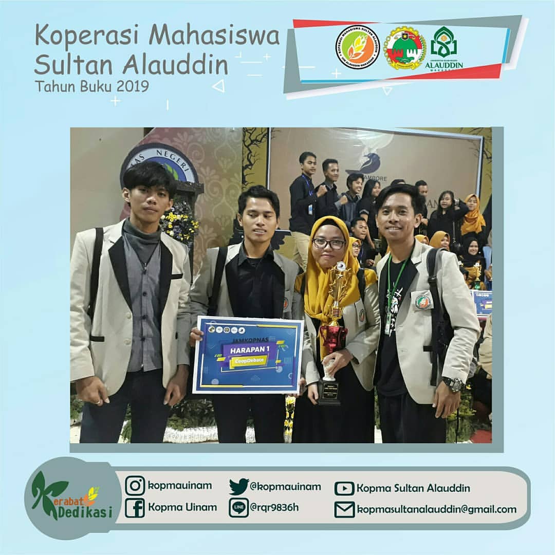Koperasi Mahasiswa (Kopma) Sultan Alauddin, UIN Alauddin Makassar meraih prestasi juara harapan 1 untuk kategori Coop Debate pada ajang Jambore Kopma Nasional (Jamkopnas) di Universitas Negeri Malang, 17-19 September.